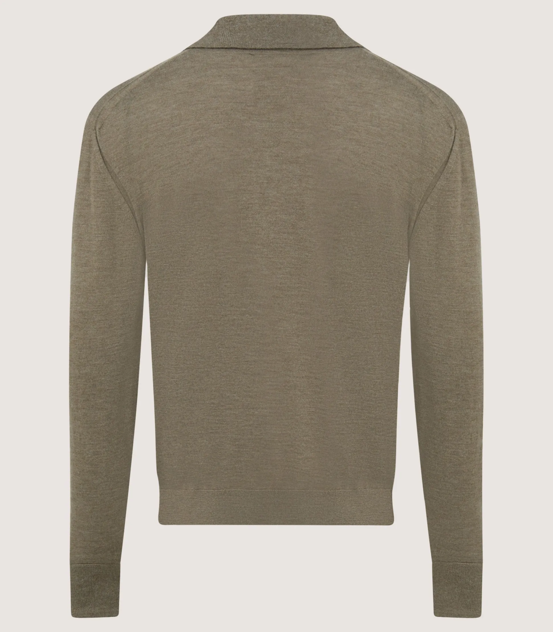 This lightweight taupe polo knit is an elevated wardrobe staple. It has a seamless knitted construction with a cashmere fabrication. Remarkably soft and comfortable, it’s perfect for travelling or daily wear.
