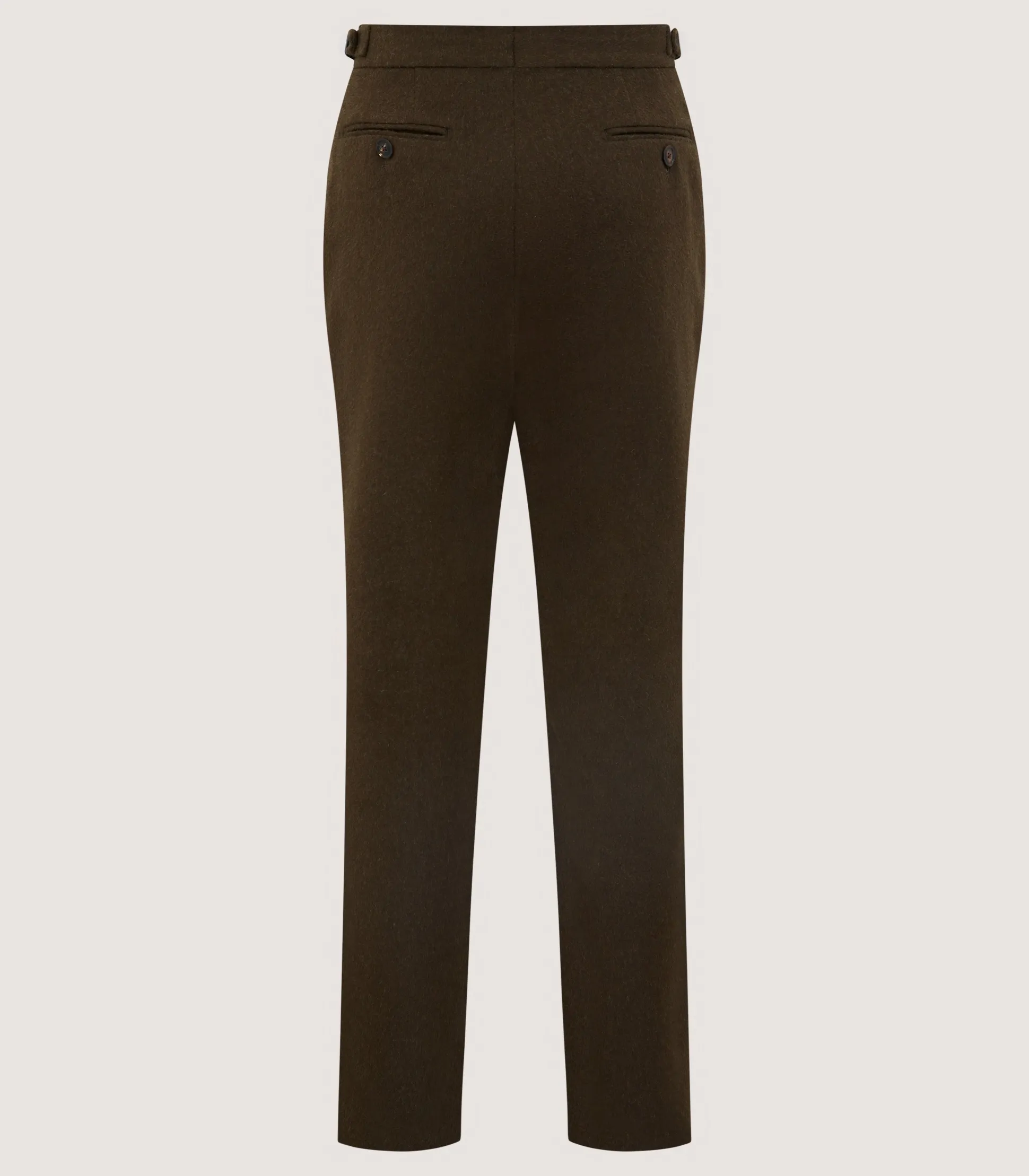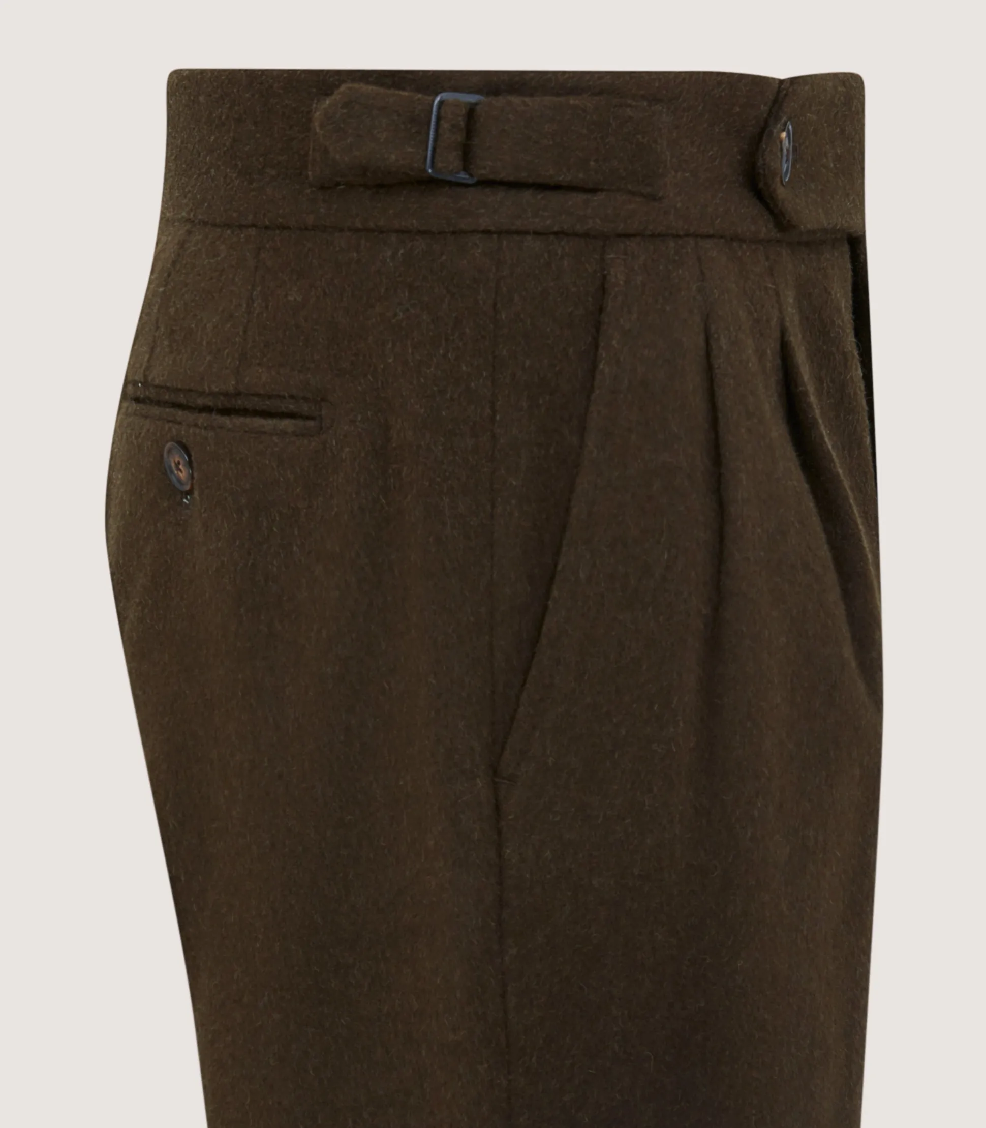 Alpaca wool has a cashmere-like softness and is quick-drying, making it an excellent choice for fieldwear fabrication. Crafted from a blend of alpaca and wool, these sporting trousers offer a superior level of comfort and breathability. They are finished with side waist buckle adjusters and a two pleat detail on the front.