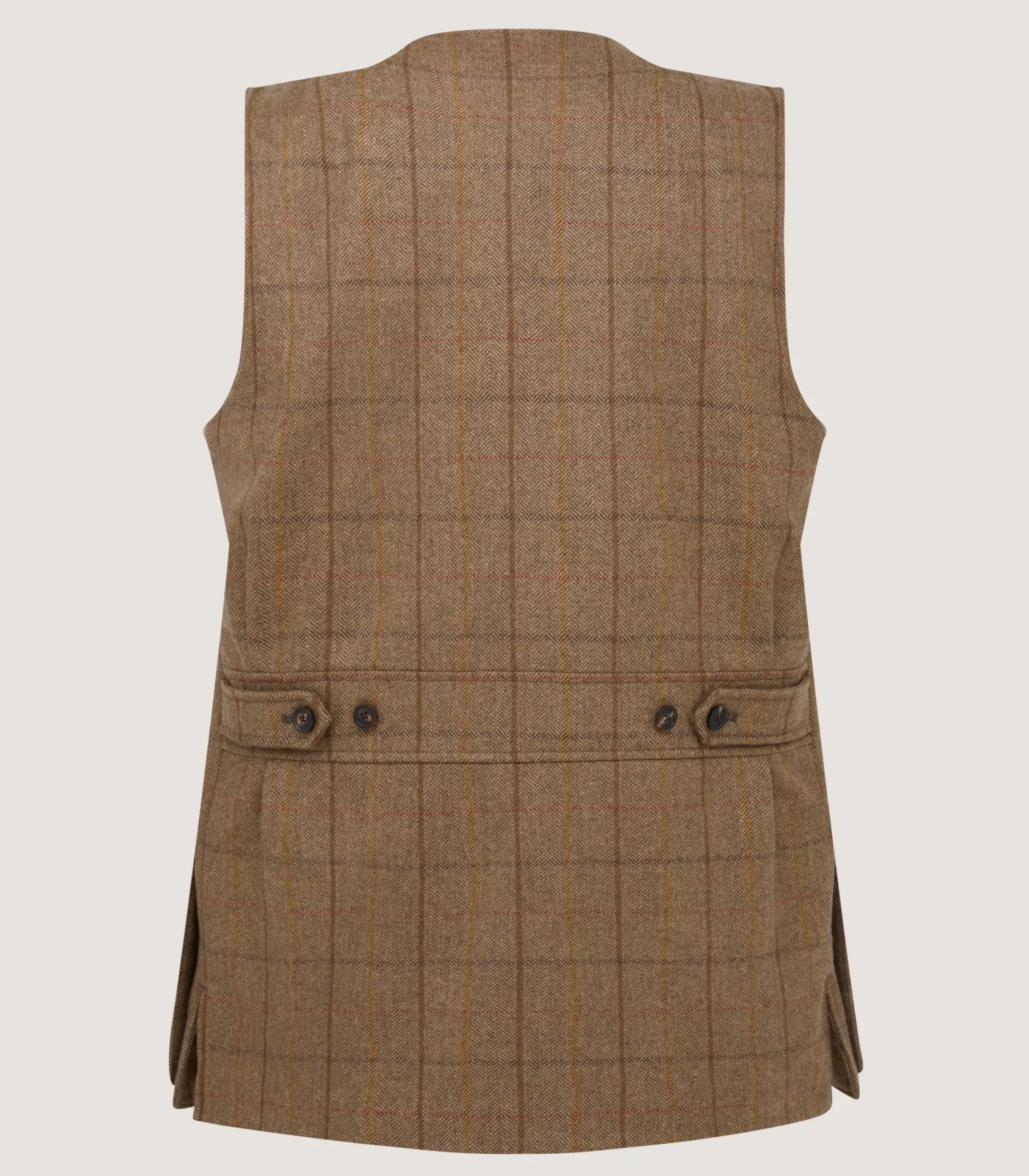Made in Portugal, this sporting vest was made from Scottish tweed. It features a traditional v-neck shape with shoulder patches for added protection and added protection. The adjustable tabs on the back can be tightened to gather the shape. It’s available in the new earthy mortar shade.