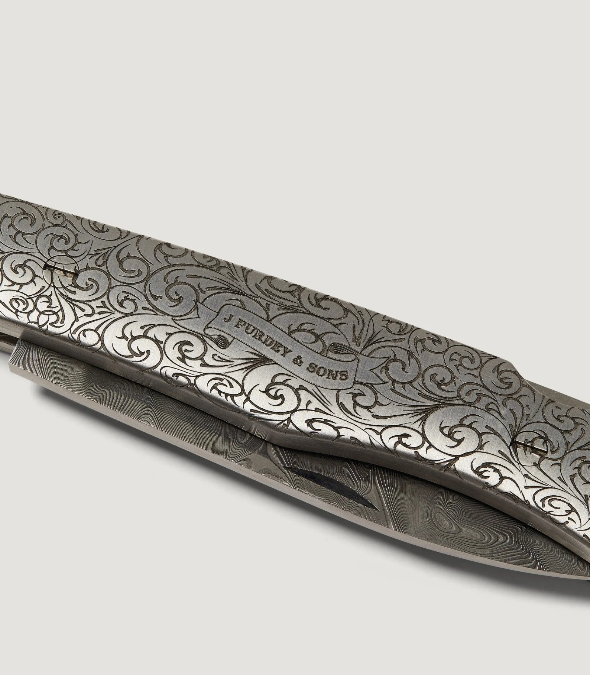 This lockback folding knife comes in mixed Damascus with steel scales which have been custom engraved with the classic Purdey Rose and Scroll seen on the action of many Purdey guns. It comes with a black sheath with featherburst branding and serial number engraved on the spine.