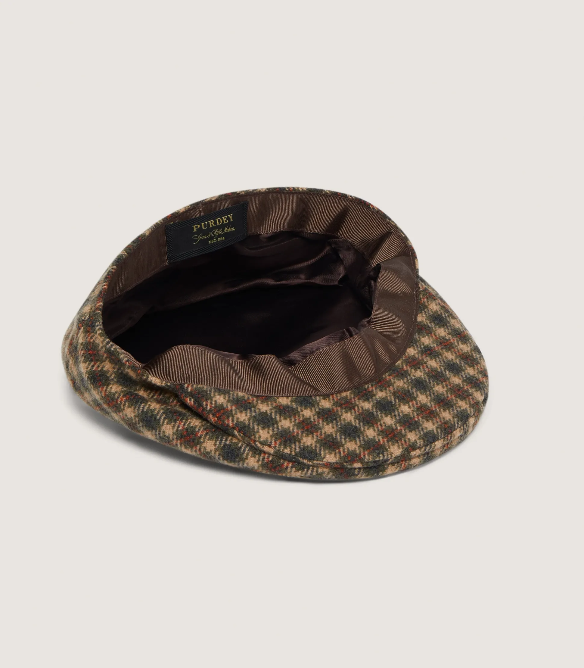 A flat cap has always been part of the traditional British field uniform. This has a waterproof, breathable membrane between the tweed and satin lining to guard against prolonged downpours. Constructed by hand with the patterns rigged by eye, the checks in the tweed are meticulously lined up with care. This style uses the more luxurious cashmere tweed. Made in the UK.