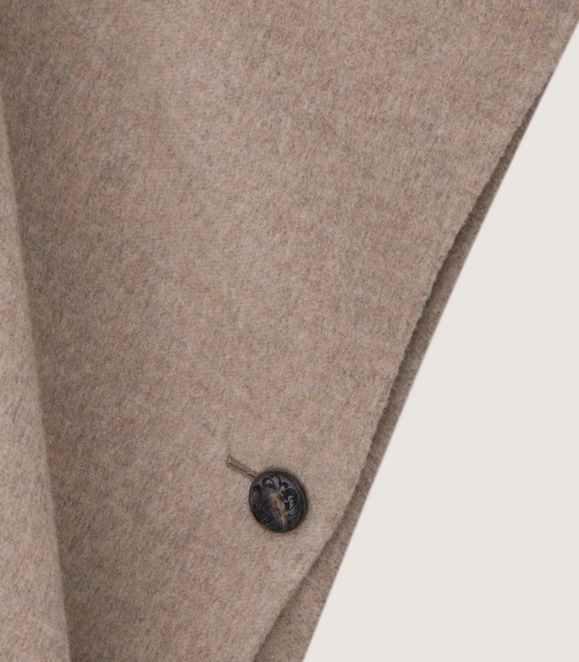 A unique alternative to your usual outerwear, this neutral-coloured cape is made from a midweight wool-cashmere blend that was woven in Italy. The soft fabrication drapes over the shoulders and the volume creates a feminine and desirable silhouette. Finished with a shawl collar and matching belt, it can be both dressed up and down.