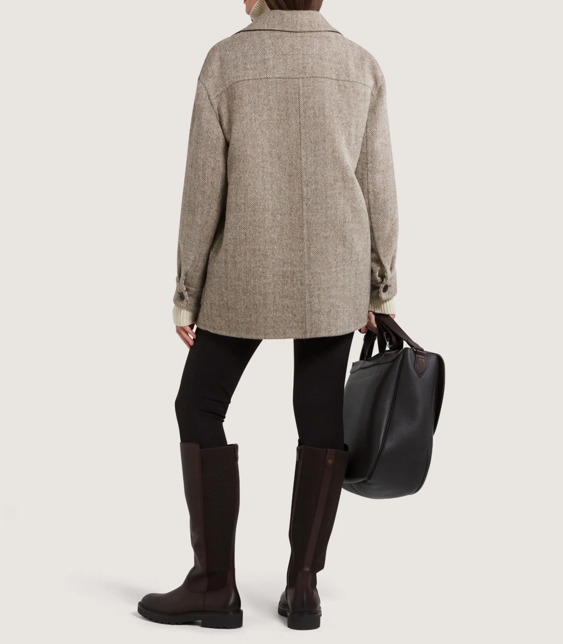 The Women’s Estate Coat adds inspiration from fieldwear to everyday wear. Crafted from Shetland wool that was woven in Scotland, it is patterned with a herringbone exterior with a complementary check interior. The soft and enveloping silhouette was expertly crafted in Italy and provides a versatile and timeless style.