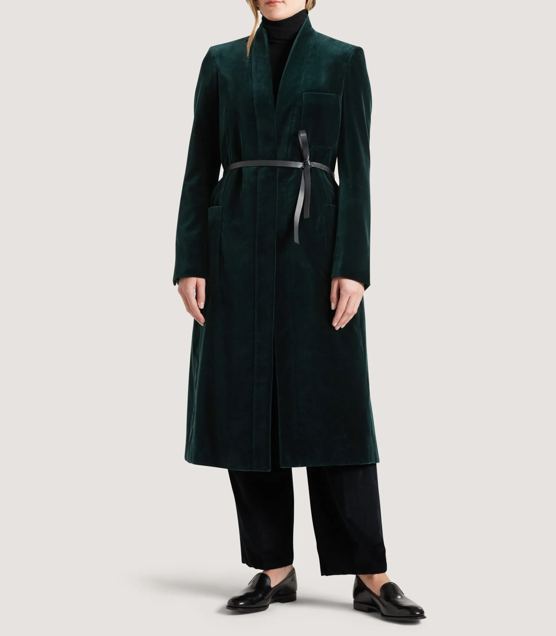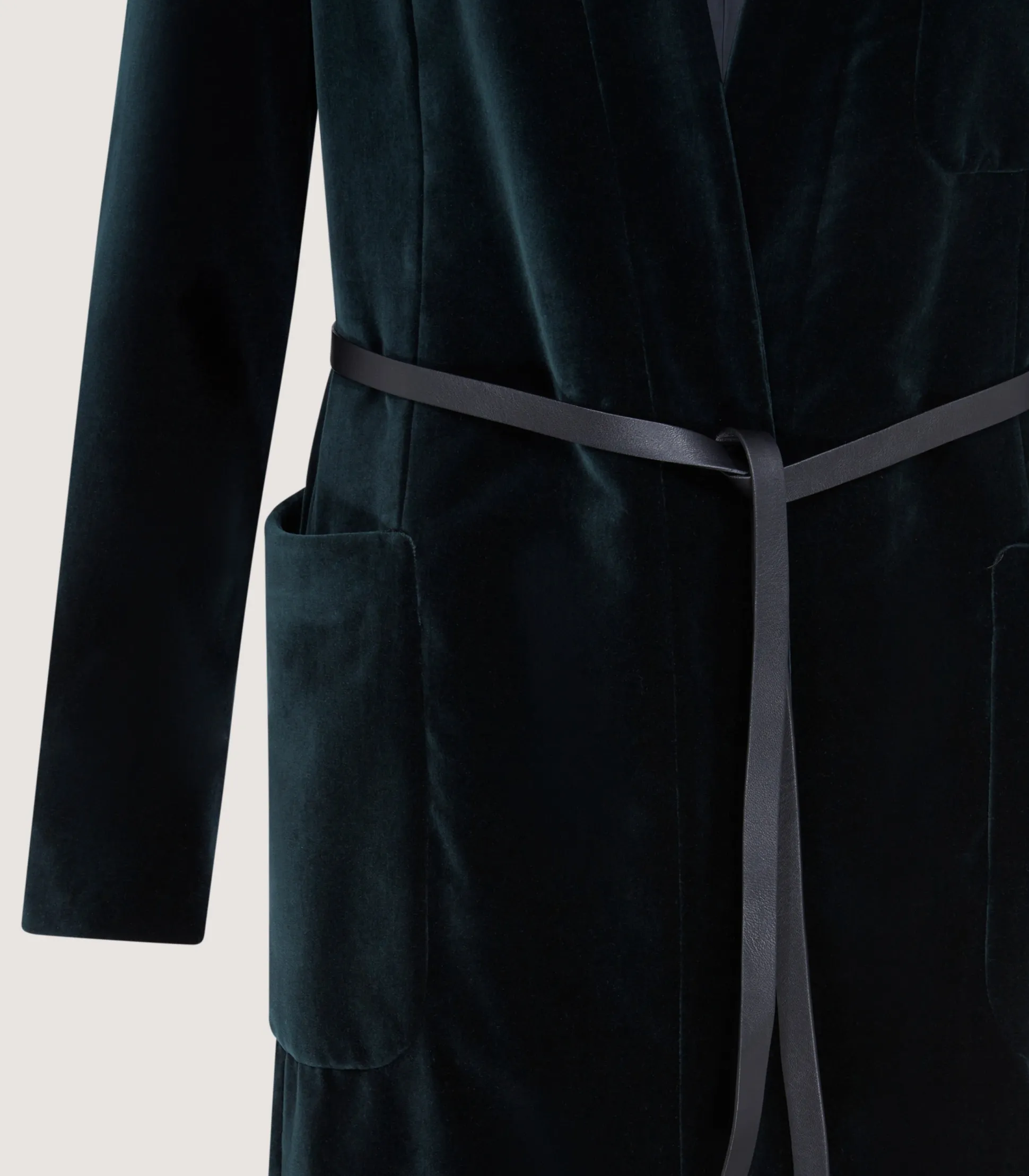 The bottle green velvet that the Women’s Estate Evening Long Jacket has been cut from elevates it into a captivating statement piece. For those who enjoy a cinched-in waist, it comes with a detachable leather belt.