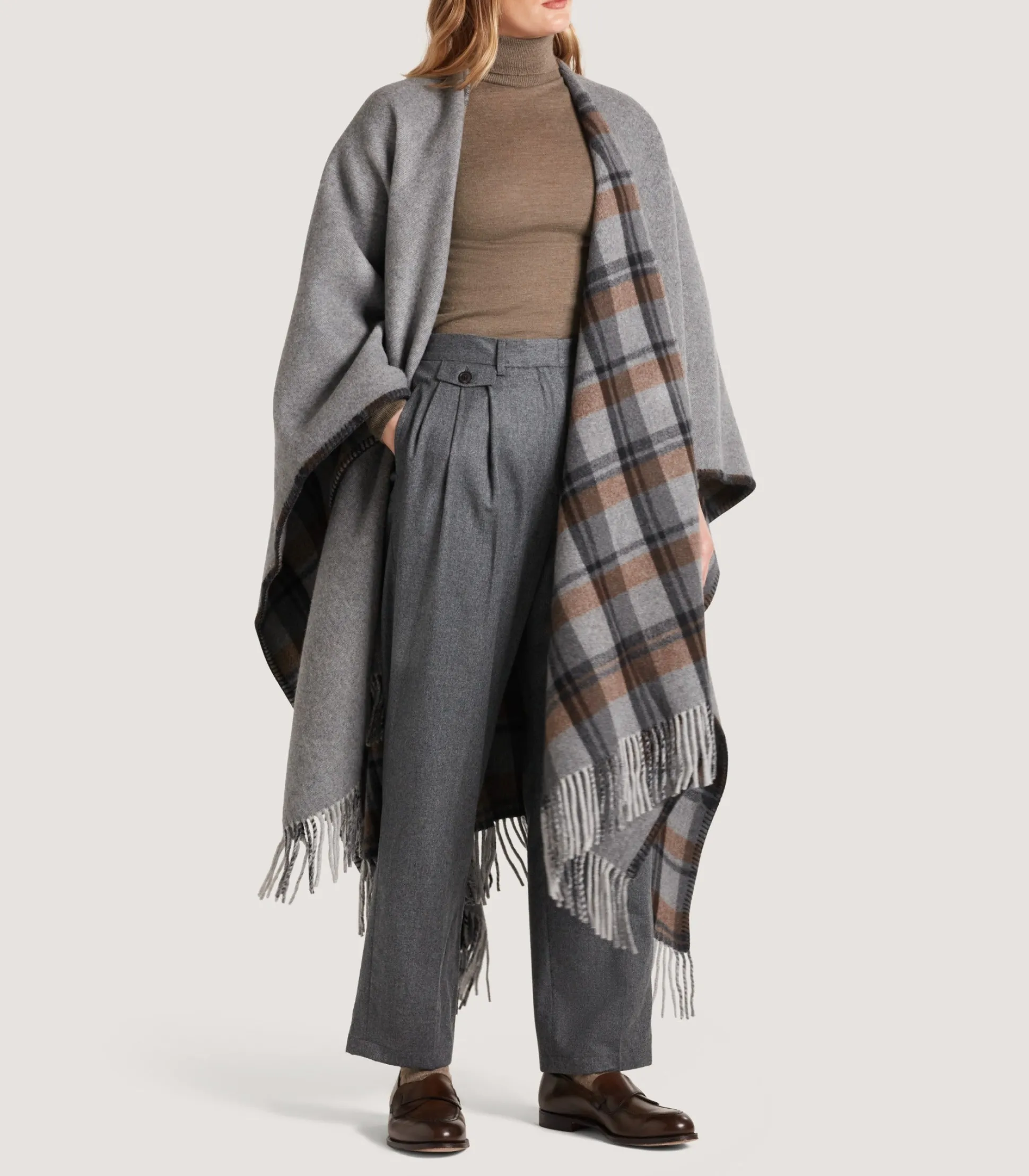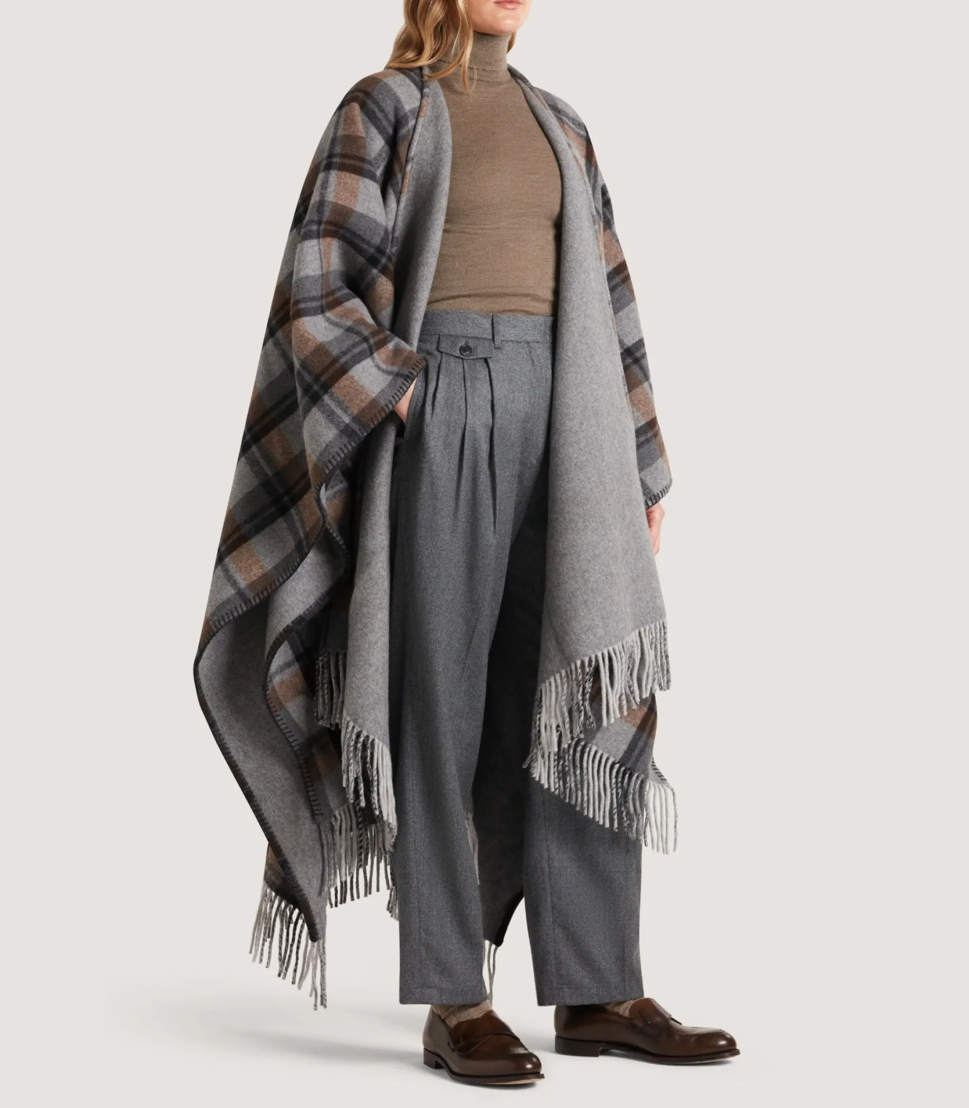 A poncho is a garment that uniquely combines leisurely style with effortless sophistication. This garment is made from an Italian double-face wool-cashmere blend. One side is patterned with a large-scale check pattern. It is finished with fringing and blanket stitching on the edges.